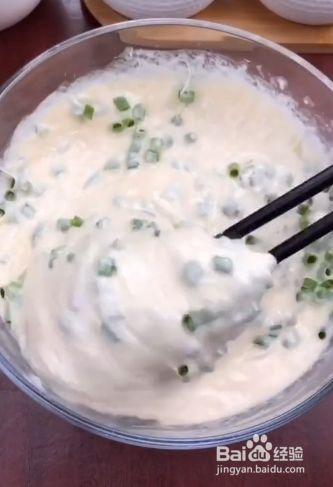醒发好后搅拌排气,加上一把葱花搅拌均匀