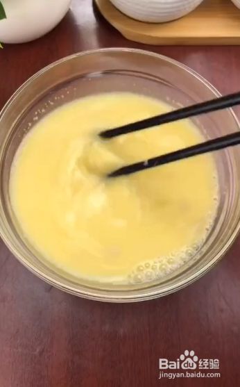 碗中加入一个鸡蛋、白糖5克、盐6克、酵母3克、温水200克搅拌至融化