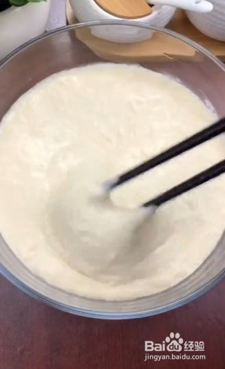 碗中加入面粉300克、泡打粉3克,倒入酵母水搅拌成软的面糊,盖上保鲜膜醒发20分钟