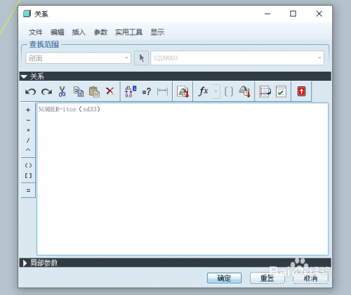 3.点击【工具】–【关系】,添加如下的关系:number=itos(sd33)(注意:sd33是小编的Proe软件的自动编号,不同人会不同)