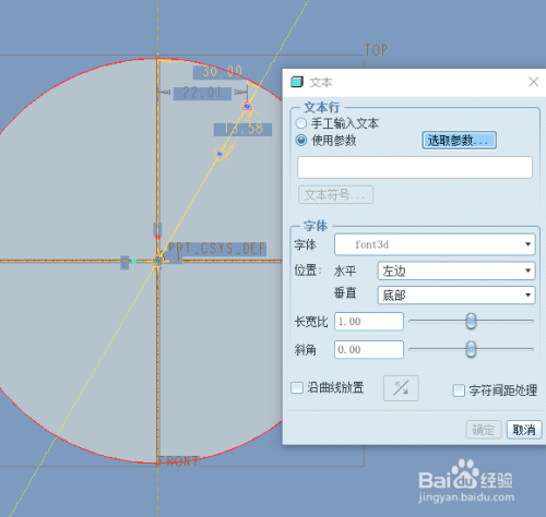 点击“文本”按钮,在绘制的中心线上选取一点并沿着中心线移动一定距离,从而确定文本高度和方向。弹出如下的窗口。勾选“使用参数”。