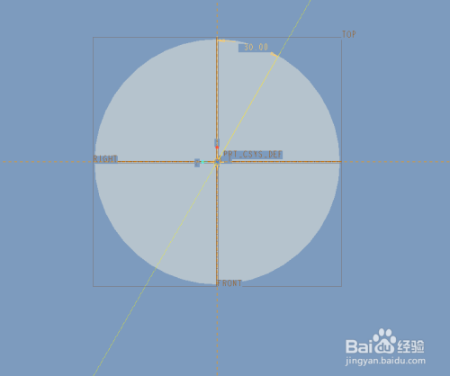 3.点击草绘,选择圆柱的端面作为草绘平面,绘制一条与垂直线角度为30的中心线。