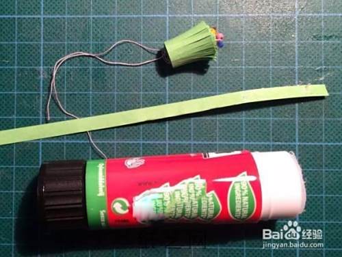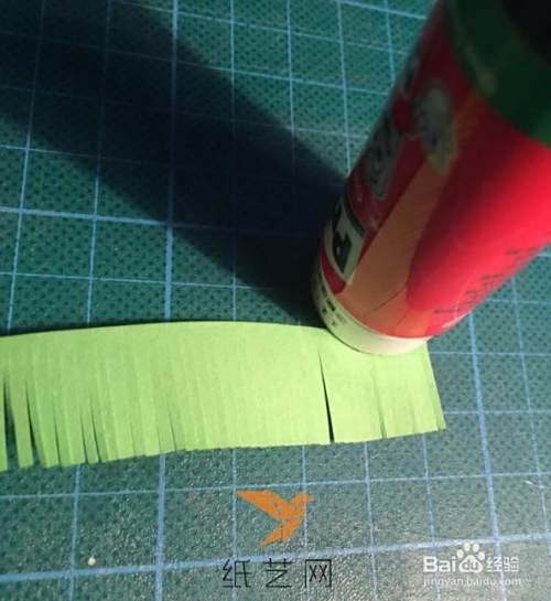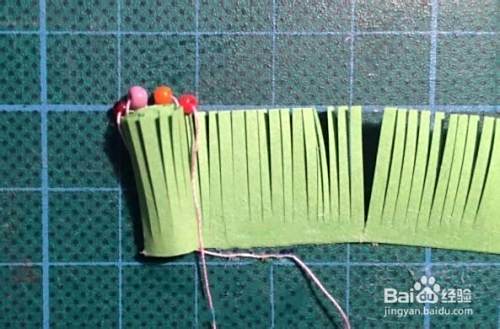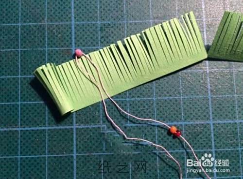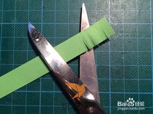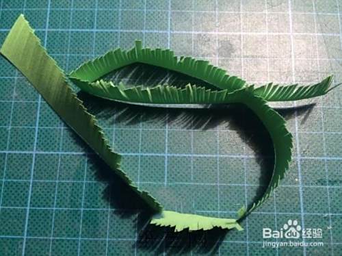 第1步:用宽的绿色衍纸纸条来将一边细细的剪一下