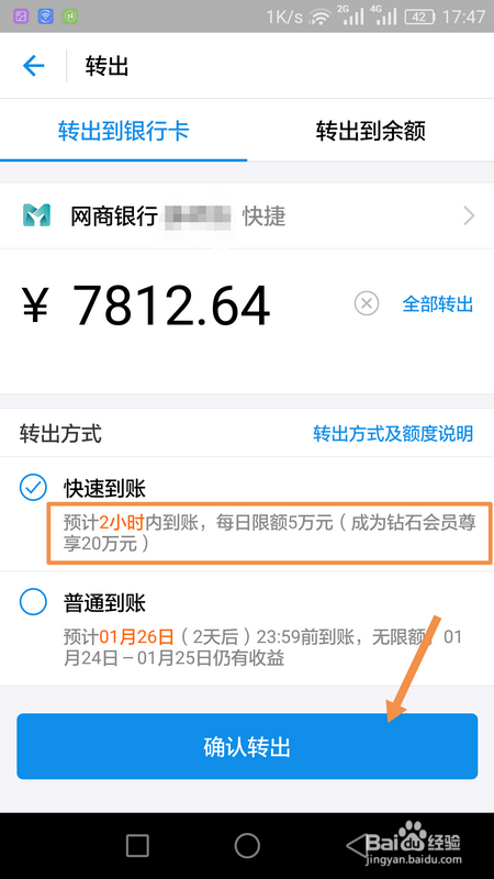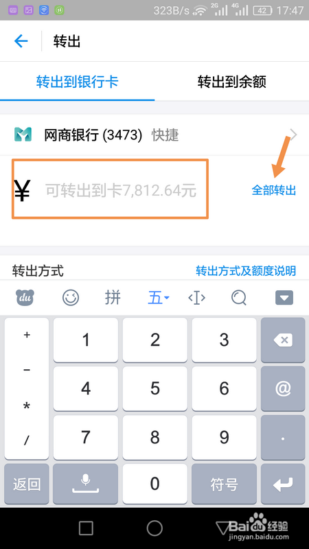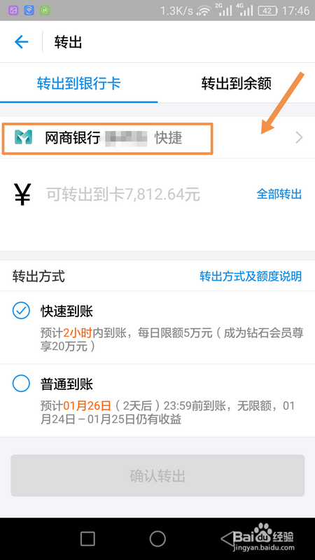 在转出对话页面中,选择转出到银行卡,并选择已绑定的网商银行,