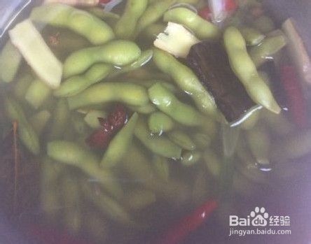 将浸泡后的毛豆连同水一同倒入锅中,加入八角,茴香,桂皮,生姜,干红辣椒。