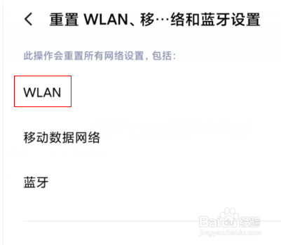 在重置WLAN、移动数据网络和蓝牙设置页面,点击WLAN进行重置即可。