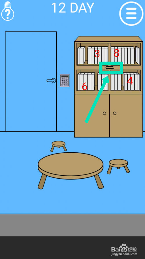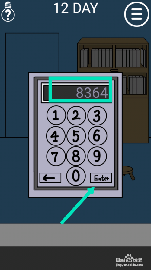 根据书架上面缺少的书的序号,上面两个是3和8,下面两个是6和4。根据书架中间的方向符号,得到密码是8364。点击门旁边的电子锁,输入密码8364,点击回车enter,开门过关。