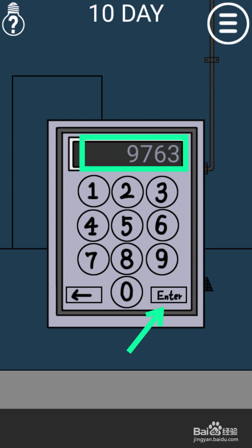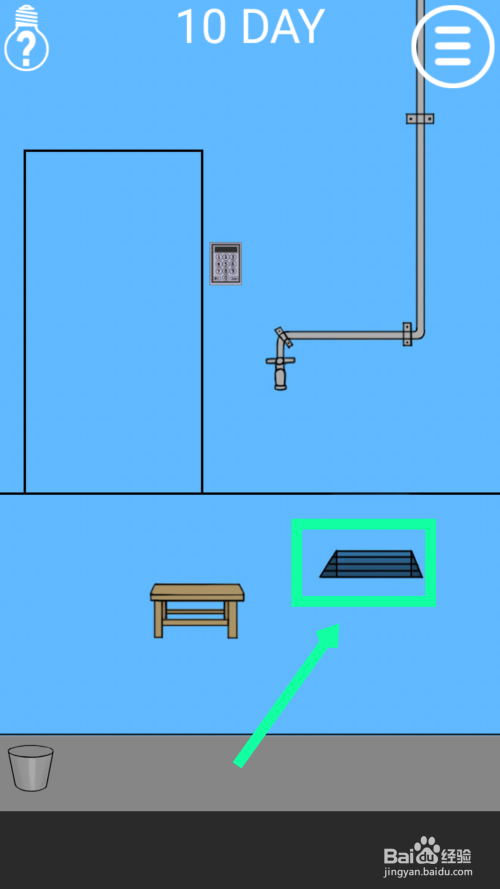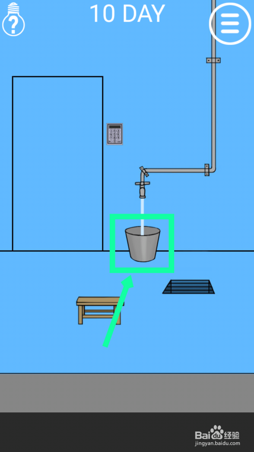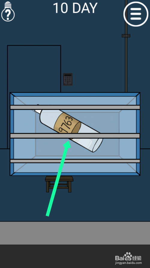 点击地上的水桶,然后拖动水桶放在水龙头下面,点击水龙头装水,水装满后点击水桶。点击地上的黑色的铁栅栏,拖动水桶到上面,能看到密码9763。点击门旁边的电子锁,输入密码9763,点击回车enter点门过关。