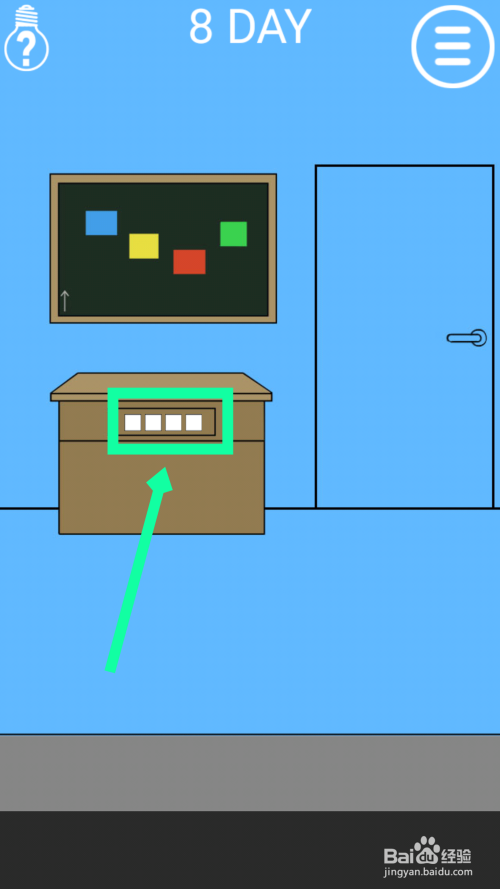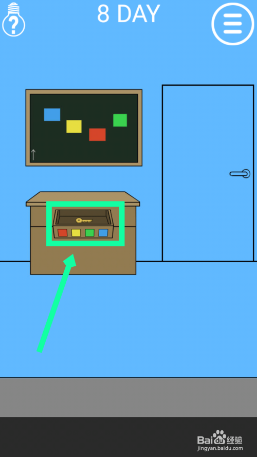 黑板上面有颜色,旁边有个向上的箭头,按照从下往上的顺序是红黄绿蓝,点击抽屉上的白色,然后按照上面的颜色排序,就会得到钥匙,用钥匙开门过关。