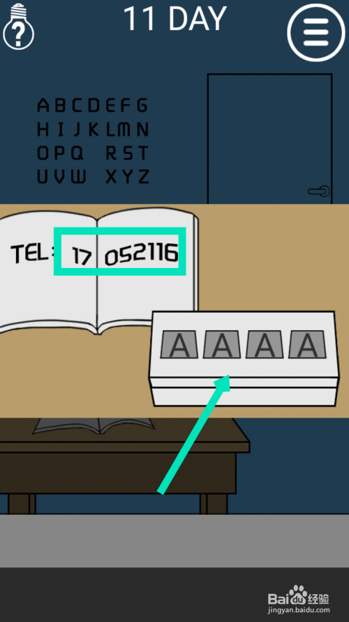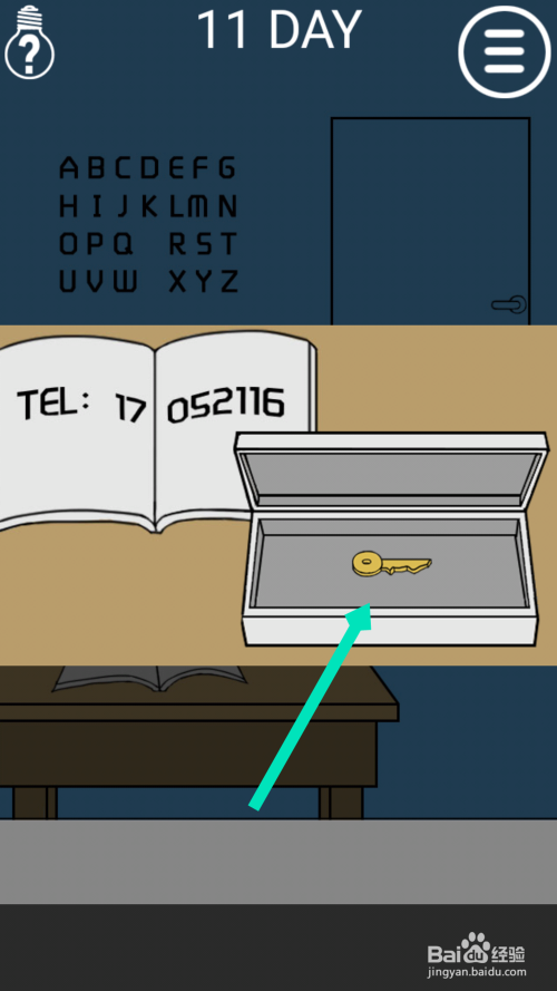 点击靠近墙的桌子上面的书,有个电话号码,数字号码对应墙上的字母,17对应的是Q,05对应的是E,21对应的是U,16对应的是P。把QEUP点击到盒子上面,会得到钥匙,用钥匙开门过关。