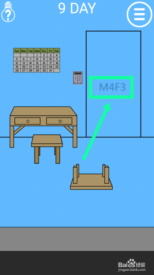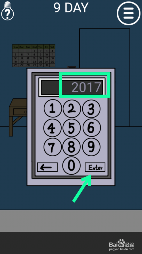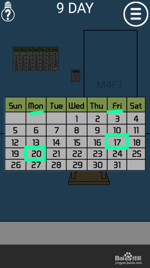 能看到门上的提示是M4F3,然后点击墙上的日历,根据日历上的数字,M4对应的是20,F3对应的是17,所以密码就是2017,点击电子锁输入2017,点击enter回车开门过关。