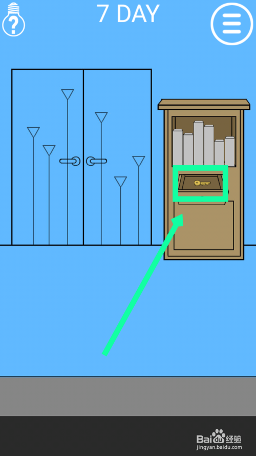 按照左边的门上面的线的高低,点击右边的格子,把积木按照线的高低一样排序。抽屉会打开,点击得到钥匙,用钥匙开门过关。