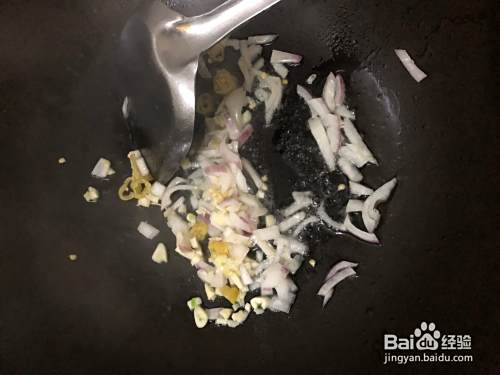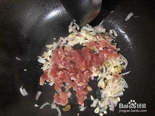 1、放油,加入洋葱、泡椒和蒜头末炒香,再放入肉沫炒下