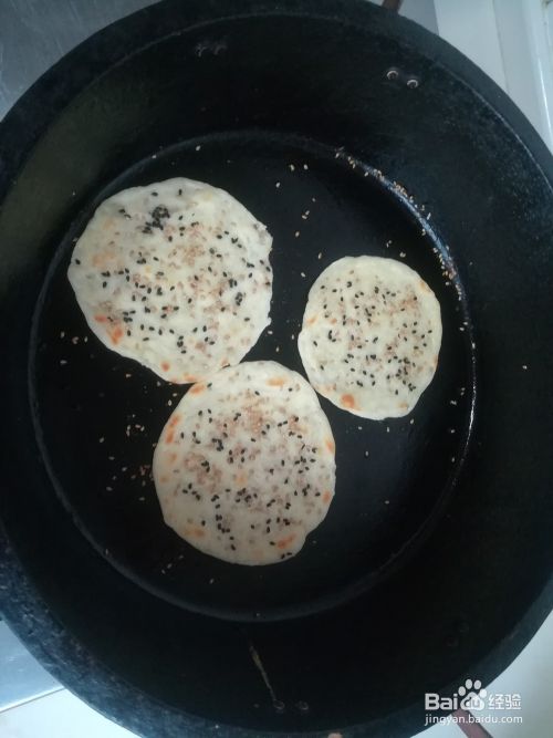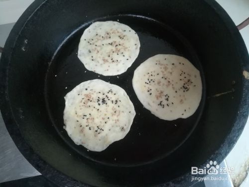 平锅里抹一层花生油滑锅,再把面饼生坯有芝麻的一面朝下摆放在平锅里。