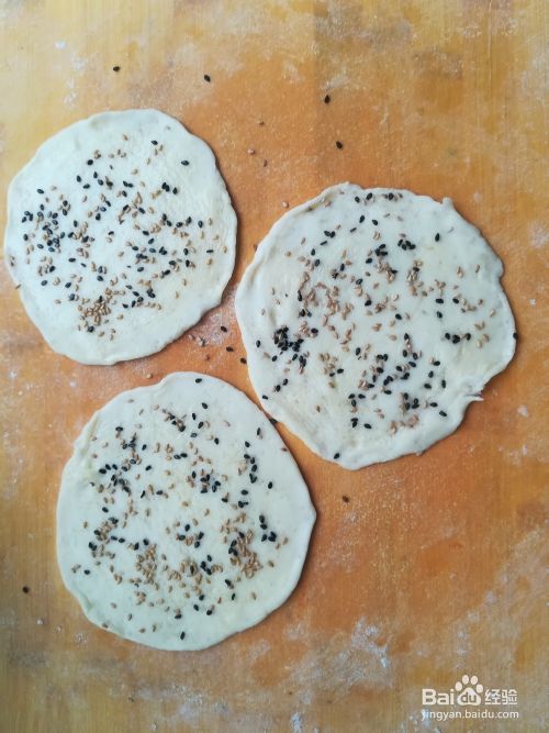 然后把小剂子的两端捏住,放在案板上,用手压扁,擀成一个小的薄饼,把上面刷上花生油,撒上芝麻,用手压一压芝麻,制成面饼生坯。