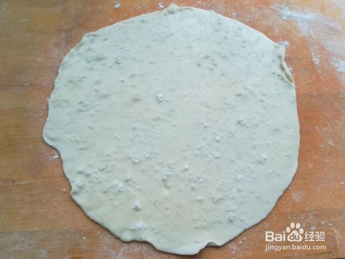 再把面团用擀面棒擀成大的面皮,在上面均匀的抹上一层猪油,再撒上糖,如果想吃咸的就放成盐。