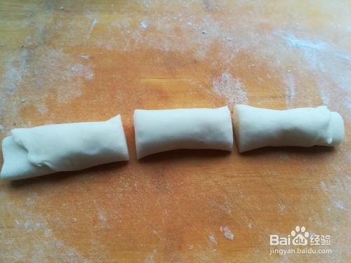 再把面皮卷起来,卷成圆柱形状,再用刀分成均匀等分的小剂子。