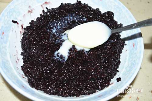 在煮好的黑米中加入2勺炼乳,搅拌均匀;