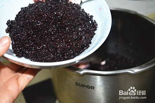 将浸泡好的黑米洗净,倒入高压锅,加入清水,大概超过黑米1cm左右的样子;