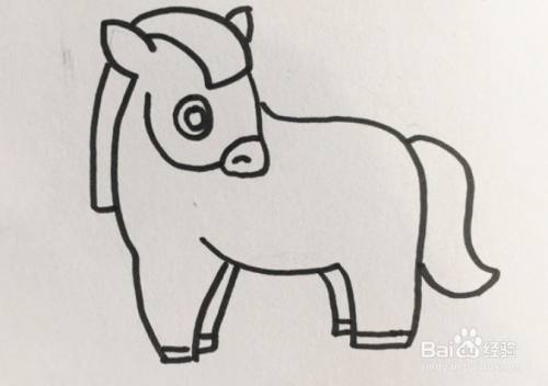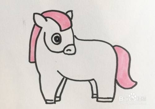 先画出小马头顶的毛和尖尖的耳朵,然后画出马的头部和身子以及尾巴,接着画上眼睛和蹄子,以及背部的毛,再把小马头顶、背部的毛和尾巴涂上粉红色,眼睛涂成黑色,鼻子和蹄子涂成深褐色,其他部分涂成黄褐色,一匹可爱的小马就画好了。