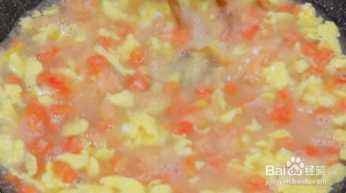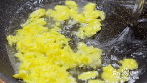 将鸡蛋不断翻炒,等到蛋液凝固后倒入适量热水。