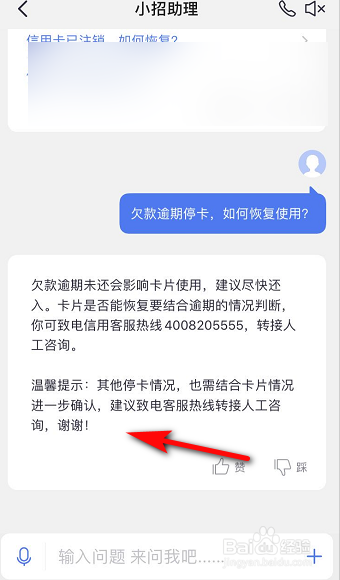 3、接着我们进入小招助理,输入停卡怎么恢复并发送,并点击第一个结果。