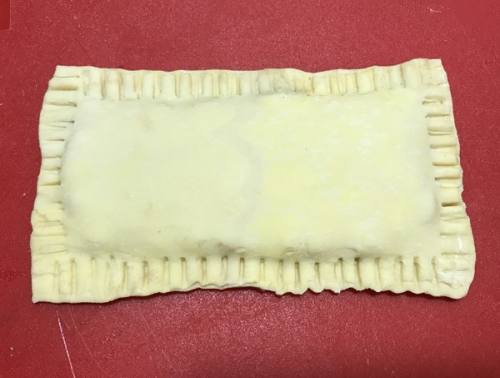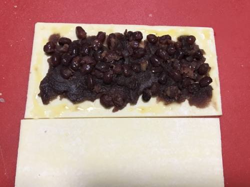 2在一半千层皮四周抹上鸡蛋液,中间放入适量红豆馅。