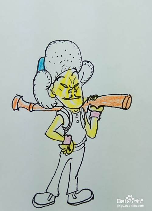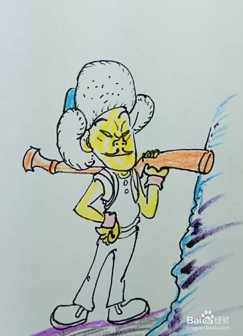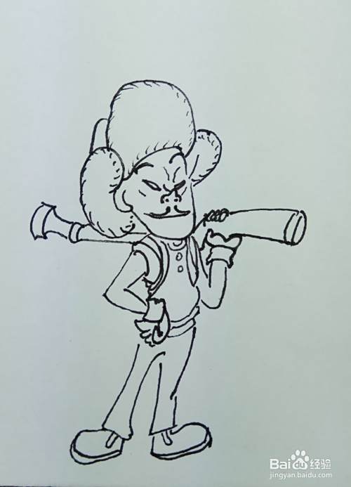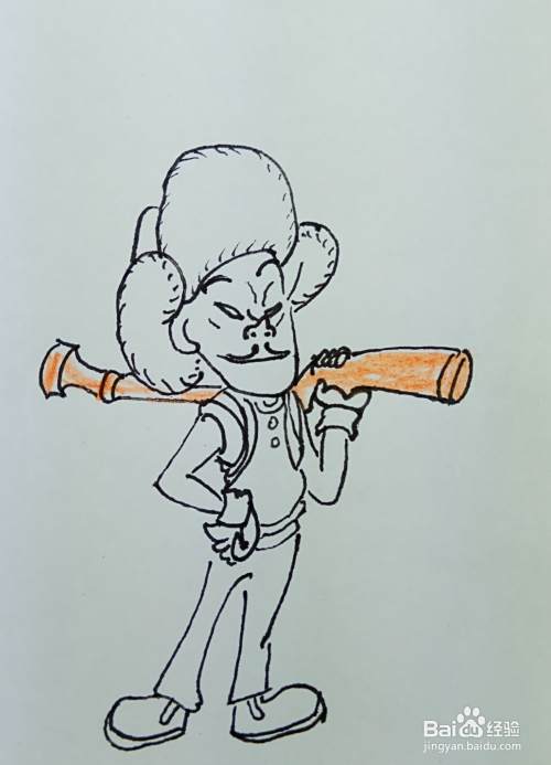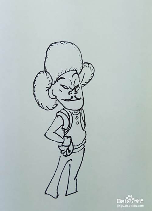 再用线条和曲线画出他的身体部分,他的右边胳膊叉着腰,正在想什么坏主意呢。