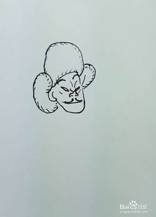在白纸上用线条和曲线画出光头强的头部轮廓,然后再画出他的眼睛,鼻子,嘴巴,还有他的胡须,并画出他头上戴着的棉帽。