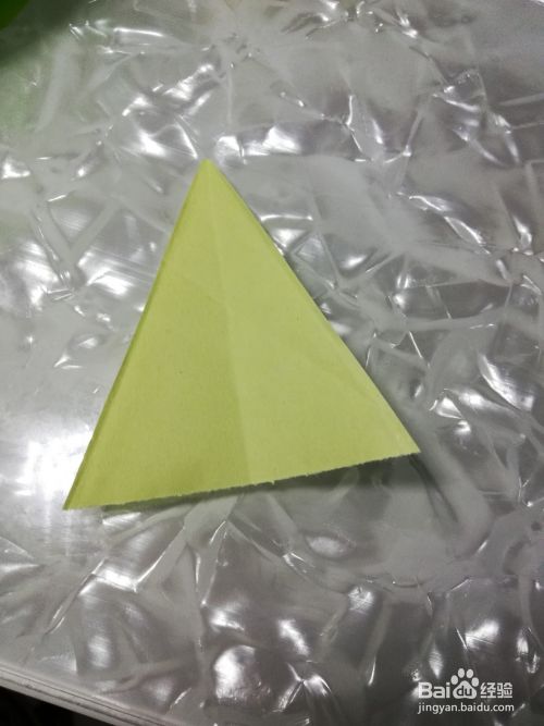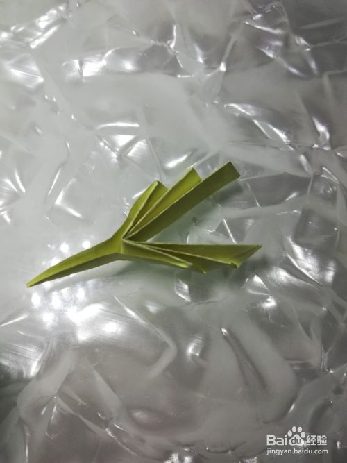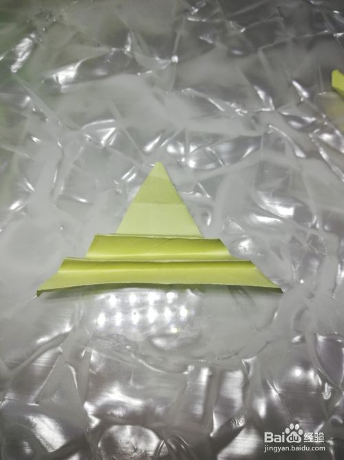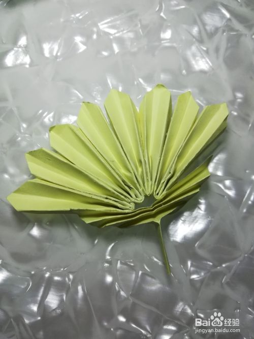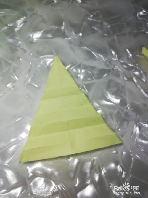 将打开后的三角形同样的像折扇子那样一层层的折叠,在最后的位置,将两侧向中间折形成一个尖角,作为树叶的径,这样下半部分就完成了。