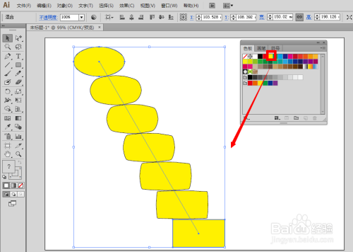 用鼠标单击一下色板的另一种颜色,比如黄色,则整个图形都被填充上黄色了。也就是说,使用黑色箭头选择工具选中图形来填充基本颜色的,都是单一的颜色,整个图形的颜色相同