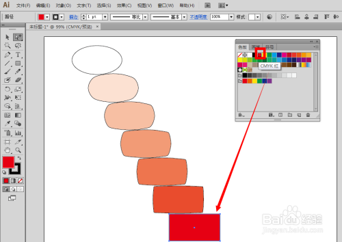 此时,我们使用”编组选择工具“,单击一下上面的椭圆形,再单击选中色板上的红色,就会在画布上看到图形从上面原来的红色逐渐变成了后面的白色
