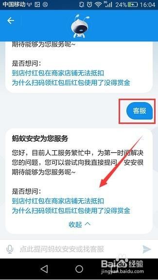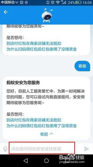 在输入框内,显示有”点此提问蚂蚁安安或找客服“