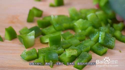 准备大虾仁、青椒丁、洋葱丁、玉米粒、番茄片作为配料。