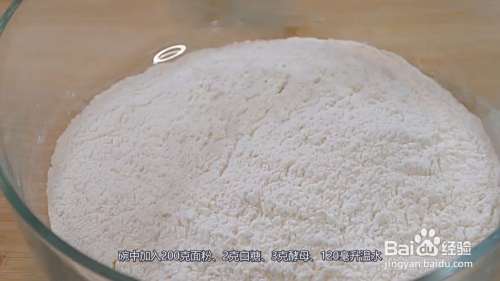 碗中加入200克面粉、2克白糖、3克酵母、120毫升温水,搅成面絮,加入10克玉米油,揉成团,醒发至两倍大。