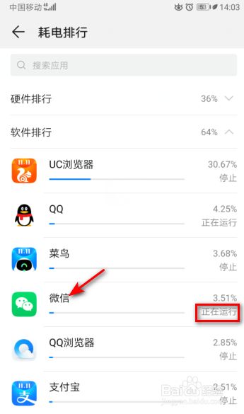 然后可以看到硬件排行和软件排行,硬件其实是无法改变的,主要耗电快就是软件,可以看到部分软件正在运行,这个就是后台运行,耗电也就会快,点击后台运行的微信。