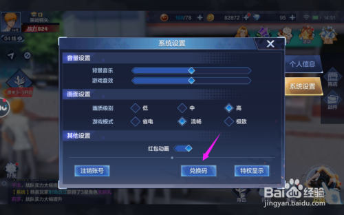 单击下【系统设置】后,单击开境界-灵压对决的【兑换码】,如图。