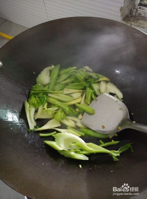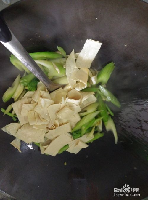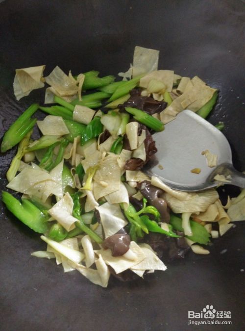 炒锅加花生油适量,加热至7成热放入生姜末炒香,再加入蒜末微炒。加入切好的芹菜,炒一分钟左右后加入豆皮和木耳、青椒,大火炒两分左右。