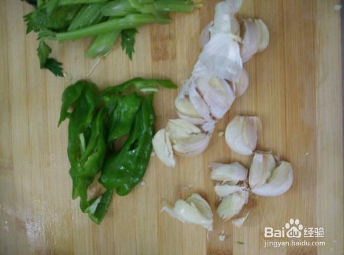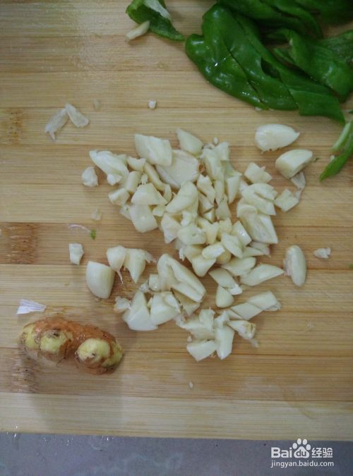 青椒切小块,生姜切碎,蒜头切碎备用。