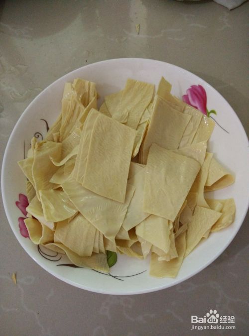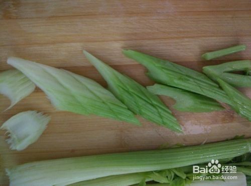 芹菜洗净切块备用,将干木耳泡发后用开水煮一会备用,干豆皮泡发后开水焯后切片备用,