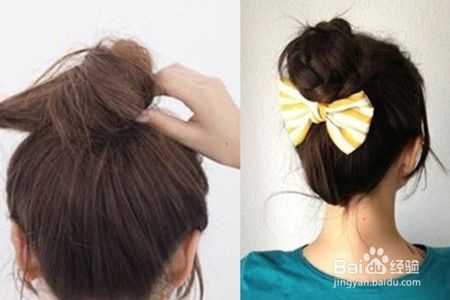第四,在头顶扎个丸子之后,还可以配上一个蝴蝶结头花。