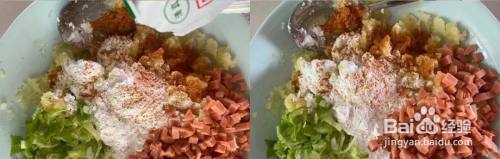 火腿肠切丁和葱花一起放入土豆泥中,放适量的盐,混合搅拌均匀;