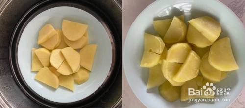 土豆削皮切成小块,放入蒸锅蒸熟;