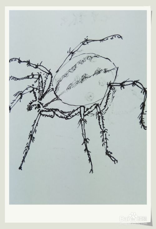 然后将蜘蛛的脚全部画完整,用线条画出蜘蛛背上的花纹。