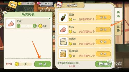 在打开的杂货铺中,选择其中的粗盐,进行购买即可。
