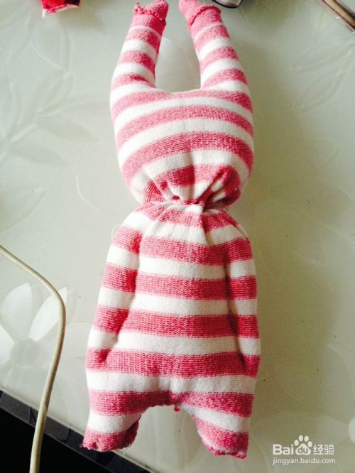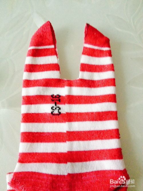 取另外一只袜子剪出脚掌部分的桶状位置,与头部连接在一起,并将下面剪出一个小缺口,塞入棉花,封住缺口。