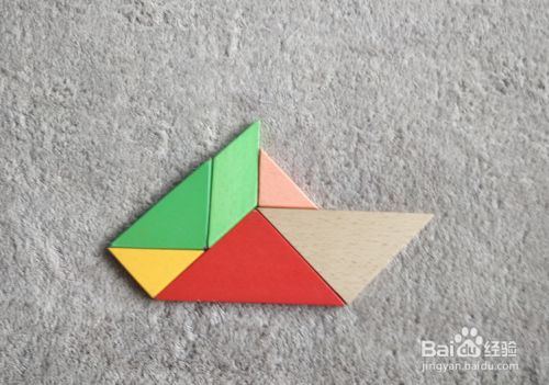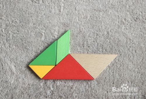 将绿色三角形直角水平居于右下,放在黄色三角形的上面挨着,直角顶点挨着黄色右顶点。