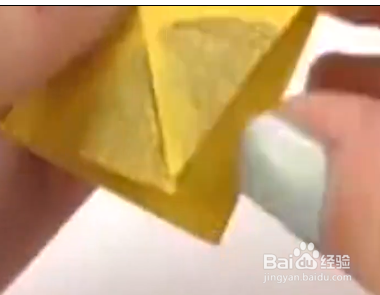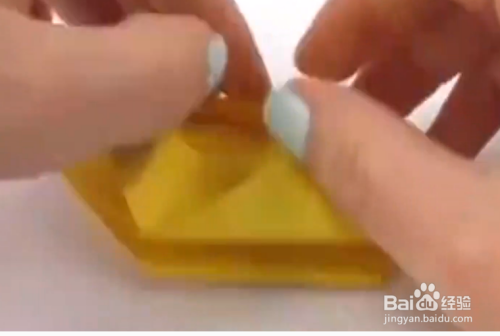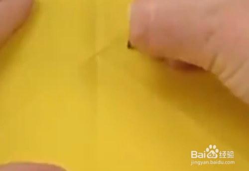 找到一张黄色的卡纸,然后将它对角线对折对折之后再对角线对折,对折好之后,再平着对折一下。