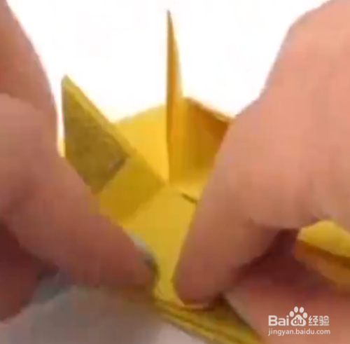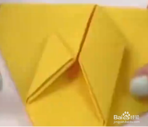 然后将它再次对折起来,中间为顶端,之后他是成为一个三角形的符号,然后将另外一边的三角形对折上去,对策好之后又是两个小三角形,然后将三角形的顶端,
