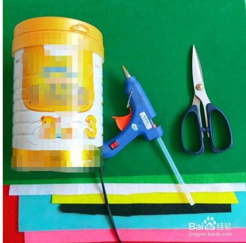 用绿色不织布包裹住奶粉罐,顶部也把不织布剪出圆形贴好